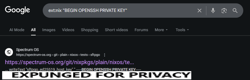 YOUR OPENSSH PRIVATE KEY WAS COMPROMISED IN A GOOGLE DORK IN CASE YOU WERE NOT AWARE! I figure that now that the important part was stated, I should share some proof of it. Attached will be a series of two (2) images. These were stumbled across while I was completing an assignment for my college course.