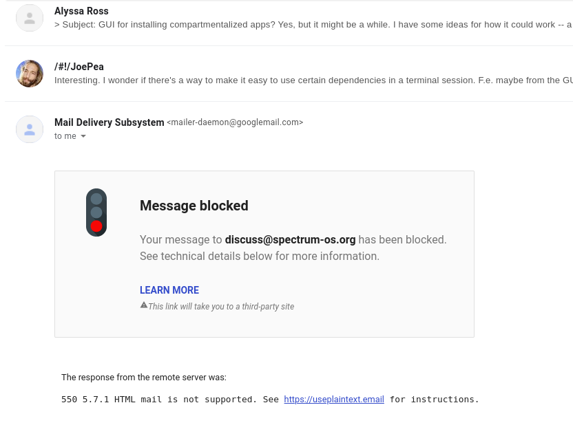 Ah, yes, this is unfortunate. Thank you for raising it. Rejecting HTML mail was a decision I made for a few reasons: - public-inbox doesn't support it. - Patches would be mangled if pasted into an HTML-generating composer. - It's been the source of several major security bugs in mail clients, because it's such a complex format. Now, given it would be good for Spectrum if people who did not know or care about the difference between HTML and plain text mail were able to ask questions and get support, I do think that probably I should relax this for the discuss@ list (but not devel@, where not mangling patches is important, and people can be expected to be a bit more technical). discuss@ could just discard HTML parts, and that would still prevent exposing other people to HTML mail, without forcing people to manually disable it in their clients. But, despite all of its many advantages, I know there are people who for whatever reason don't want to use email, and that's why we have a Hyperkitty. If you prefer reading and writing messages in a web browser, that's what Hyperkitty is there for. You don't have to use a mail client if you don't want to. Unlike, with GitHub/GitLab, nobody is forced to use any particular way of interacting with the discussions. That's one of the best things about mailing lists. ;)
